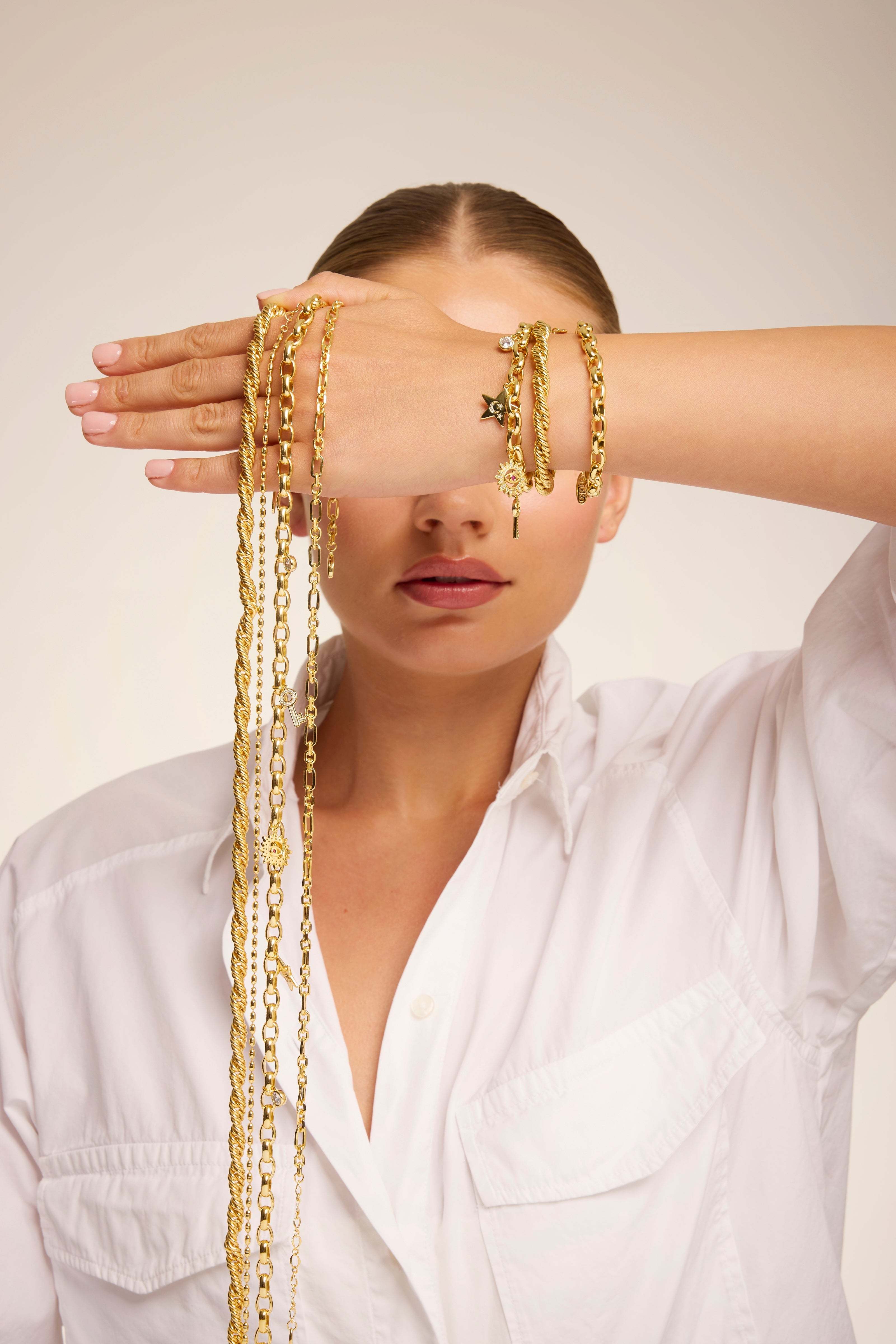 The Stargaze huggie earring set includes 6 mismatched mini huggies, each with its own starry charm and crystal accent for a playful, cosmic-inspired look. Crafted in polished 14k gold plating with sparkling cubic zirconia, this set features a mix of black and white stones, dangling stars, moons, and geometric drops. Perfect for stacking, mixing, and styling your ear party with a trendy, cosmic twist. Plated in 18k Gold.