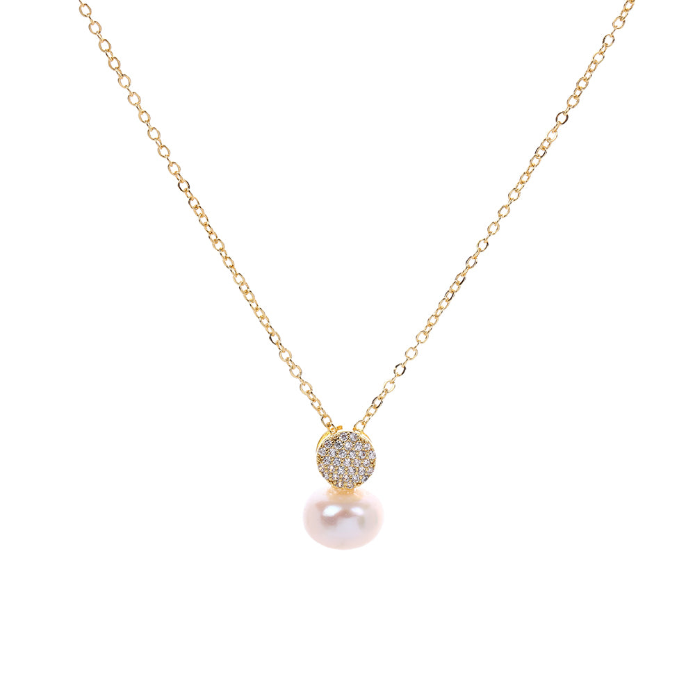 Graceful and radiant, the Pavé Circle & Pearl Drop Zerlin Necklace features a shimmering pavé-set disc paired with a luminous pearl, all suspended from a delicate gold chain. This timeless piece exudes elegance with a modern twist, making it ideal for weddings, romantic evenings, or elevating your everyday look. Plated in 18k Gold.